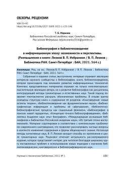 Bibliography and library studies in the information era: Possibilities and prospects. (Thoughts on the book: Leonov V. P. Selected works / V. P. Leonov ; RAS Library. Saint Petersburg : LAS, 2021. 564 p.)
