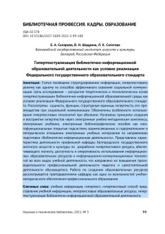Опубликовано ср, 08/24/2022 - 19:57 пользователем Гость (не проверено) Научные и технические библиотеки. 5 / 2021 PDF Открыть Научная статья гипертекстуализация библиотечно-информационной образовательной деятельности hypertext hypertext representation of learning information hypertext educational resources hypertextualization library and information educational activities гипертекст гипертекстовый способ представления учебной информации гипертекстовые образовательные ресурсы ГПНТБДата публикации: 2021-07-22Серия: Научные и технические библиотекиВыпуск (issue): 5Страницы: 99-108Идентификатор: oai:oai.gpntb.elpub.ru:article/782https://ntb.gpntb.ru/jour/article/view/78210.33186/1027-3689-2021-5-99-108 Лицензия: CC BY Источник: ntb.gpntb.ru В открытом доступе