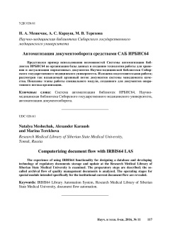 Опубликовано ср, 08/24/2022 - 19:57 пользователем Гость (не проверено) Научные и технические библиотеки. 11 / 2016 PDF Открыть Научная статья автоматизация документооборота Research Medical Library of Siberian State Medical University document flow automation Научно-медицинская библиотека Сибирского государственного медицинского университета ГПНТБДата публикации: 2016-11-01Серия: Научные и технические библиотекиВыпуск (issue): 11Страницы: 117-125Идентификатор: oai:oai.gpntb.elpub.ru:article/117https://ntb.gpntb.ru/jour/article/view/11710.33186/1027-3689-2016-11-117-125 Лицензия: CC BY Источник: ntb.gpntb.ru В открытом доступе