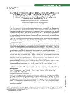 Цель статьи – взглянуть на практику опубликования статьи с точки зрения ученых, работающих в четырех тематических областях: бионауке, астрономии/физике, образовании и истории. Авторы статьи изучают, каким образом эти тематически перекрывающиеся области пересекаются с журнальным ландшафтом и почему в результате появляются новые участники системы научной коммуникации, в частности мегажурналы открытого доступа (OAMJs). OAMJs (например, PLOS ONE и Scientific Reports ) – это крупные журналы с широким тематическим охватом и открытым доступом, которые основывают решение о публикации статьи исключительно на ее технической/ научной значимости. Структура и методологический подход к исследованию: в пяти высших учебных заведениях Великобритании были созданы фокус-группы с активно работающими в этих областях исследователями. Данные анкетирования были дополнены интервью с проректорами по научной работе в каждом университете. Важнейшим результатом, полученным на основе анализа собранных данных, является представление о том, как исследователи понимают свою принадлежность к этим различным научным сообществам, причем каждому сообществу присущи свои внутренние представления. Было установлено, что понимание исследователями механизмов оценки играет основную роль в отношении к OAMJs; интервью с проректорами по научной работе показывают, что существует разница между восприятием исследователей и ценностями, заложенными в институциональные рамки. Оригинальность/ценность статьи: это первое исследование, проведенное с использованием исключительно качественных методов, касается перспектив использования OAMJs исследователями. Выводы этой статьи будут представлять интерес для издателей, лиц, принимающих решения, руководителей научных исследований и ученых.