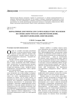 Предлагаемая Вашему вниманию статья по разрешению ее автора перепечатывается из журнала «Библиотечный адвокат». И сам автор, и ведущие специалисты библиотек и вузов культуры, где есть аспирантура и сдаются экзамены по специальности, выражают желание высказаться по поводу предлагаемой программы-минимум и паспорта специальности. Ждем Ваших замечаний и предложений. Одним словом, приглашаем к дискуссии.