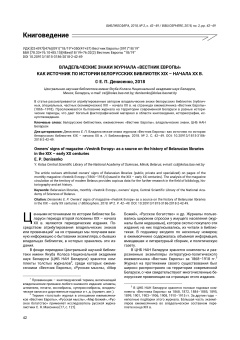 В статье рассматриваются атрибутированные автором владельческие знаки белорусских библиотек (публичных, специальных, частных (коммерческих) XIX - начала ХХ в. на страницах ежемесячника «Вестник Европы» (1866-1918). Прослеживается бытование журнала на территории современной Беларуси в разные исторические периоды, что дает богатый фактографический материал в области книговедения, историографии, искусствоведения.