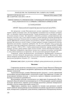 Для орошаемых условий Нижневолжского региона характерно длительное и весьма жаркое, нередко засушливое лето, что благоприятно сказывается как на овощных культурах, так и на развитии сорной растительности. Сорная растительность существенно затеняет посевы овощных культур. Это приводит к активному развитию и распространению вредителей и болезней, что в свою очередь является главной причиной снижения урожайности культурных растений. Основной целью исследований стала разработка экономически обоснованной эффективной системы защиты лука репчатого в борьбе с однолетними сорными растениями при капельном способе полива в условиях аридного климата Астраханской области. Приведены результаты испытания гербицидов Гоал 2Е, КЭ и Лазурит, СП на основе действующего вещества метрибузина в орошаемых условиях землепользования ФГБНУ «ПАФНЦ РАН» за период с 2020 по 2022 гг. Среди сорняков присутствовали: щирица синеватая запрокинутая; молочай; лебеда садовая; пырей; вьюнок полевой; солянка обыкновенная (курай), горчак. Обработка гербицидами существенно снизила число сорняков на посадках лука репчатого, что особенно проявилось на вариантах, где был использован препарат Лазурит, СП. Устранение сорной растительности способствовало формированию достаточно высоких значений товарной урожайности возделываемой культуры. Максимальные показатели товарной урожайности 88,0 и 91,0 т/га были получены на вариантах совместного применения препаратов Лазурит, СП + Аминовит.