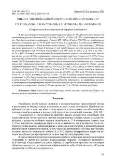 В двух исследованиях использованы инкубационные яйца 26-40-недельных мясо-яичных кур аутосексных кроссов «Доминант ЦЗ»: «Д-104», «Д-107», «Д-149», «Д-192», содержащихся в клетках. Инкубировали яйца в инкубаторах «Стимул ИП-16М» и «Стимул ИВ-16М» по стандартному режиму, с поворотом яиц на 43-45 град. через 45 мин. В исследовании 1 использовали 699894 шт. яиц со сроком хранения 2-8 дней (в контрольных лотках - 22923 шт.), в исследовании 2-2016 шт. яиц после хранения до 4 и 8 дней. В течение 15 нед. продуктивного периода интенсивность яйценоскости кур кросса «Д-192» была больше кросса «Д-104» всего на 0,6%, а «Д-107» и «Д-149» -на 2,6 и 3,0%. В пиковую и постпиковую фазы продуктивного периода пригодность яиц к инкубации от кур кросса «Д-104» в сравнении с остальными кроссами была больше на 0,1-2,2%. По выводу цыплят родительское стадо кур кроссов «Доминант ЦЗ» в технологических и кормовых условиях ООО «Агрокормсервис плюс» соответствует минимальному требованию при разведении яичных кур с коричневой скорлупой - 78,0%. В средний, или предплодный период (6-18 сут.), гибель эмбрионов несколько выше в яйцах кур «Д-107» и «Д-192» (на 1,58 и 1,98%), но ниже в яйцах кур «Д-104» и «Д-149» (на 0,2%), или в среднем больше на 0,79%. Разница между выводом в контрольных лотках и в целом по всем партиям яиц по кроссам «Д-104», «Д-149» и «Д-192» была в диапазоне от -0,1 до +0,3%, а по кроссу «Д-107» больше - +1,8%. В среднем по всему массиву яиц разница составляет +1,0%. При хранении яиц «Доминант ЦЗ» больше 4 дней снижается вывод молодняка в среднем на 1,0% в сутки за счет повышения смертности эмбрионов во все возрастные периоды. С учетом разного размера партии яиц от нескольких кроссов кур для надежности анализа можно вскрывать из контрольных лотков (2-3% от партии) от 35 до 180 шт. отходов инкубации.