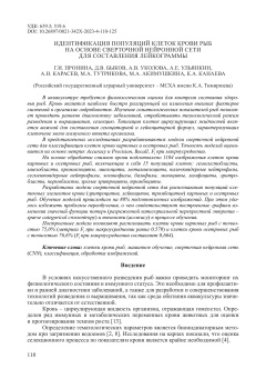 В аквакультуре требуется физиологическая оценка для контроля состояния здоровья рыб. Кровь является наиболее быстро реагирующей на изменения внешних факторов системой в организме гидробионтов. Изучение гематологических показателей рыб позволяет проводить раннюю диагностику заболеваний, отрабатывать технологический режим разведения и выращивания, селекцию. Типизация клеток циркулирующих жидкостей является важной для составления гемоцитарной и лейкоцитарной формул, характеризующих клеточное звено иммунного ответа организма. В представленных исследованиях разрабатываются модели сверточной нейронной сети для классификации клеток крови карповых и осетровых рыб. Точность моделей оценивается на основе метрик Accuracy и Precision, Recall, F 1 при макроусреднении. На основе обработки снимков крови подготовлено 1104 изображения клеток крови карповых и осетровых рыб, включающие в себя 15 популяций клеток: гемогистобласты, миелобласты, промиелоциты, миелоциты, метамиелоциты, палочкоядерные нейтрофилы, сегментоядерные нейтрофилы, эозинофилы, базофилы, моноциты, лимфоциты, эритробласты, нормобласты, зрелые эритроциты, тромбоциты. Разработаны модели сверточной нейронной сети для распознавания популяций клеточных элементов крови (эритроцитов, лейкоцитов, тромбоцитов) карповых и осетровых рыб. Обучение моделей происходило на 80% подготовленных изображений. При этом удалось избежать проблемы переобучения, о чем свидетельствуют построенные графики изменения значений функции потерь (разреженной категориальной перекрестной энтропии – sparse categorical crossentropy) и точности (accuracy) в процессе обучения. Построенные модели позволяют распознавать клетки крови карповых рыб с точностью 75,0% (метрика F 1 при макроусреднении равна 0,570) и клетки крови осетровых рыб с точностью 76,6% (F 1 при макроусреднении составляет 0,664).