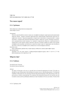 Объектом данной работы является город как специфическая форма территориальной организации общества. Задача - выявить основные характеристики, определяющие современный город как специфическое явление. Продемонстрирована историческая изменчивость представлений о городе, связанная с историческим развитием феномена города и общества в целом. Показана относительность разграничения между городом и не городом в современном обществе и проблематичность определения четких границ города. Дополнен перечень основных атрибутов города, куда помимо специфической застройки, заселенности и занятости входят такие его параметры, как способность выступать в качестве специфического сообщества и в качестве формы капитала.