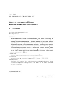 Рассматривается педагогическая составляющая драматургии Сенеки. Предлагается решение затруднения, заключающегося в том, что, с одной стороны, в своих философских трактатах Сенека однозначно заявляет о пагубном влиянии страстей на душу человека, с другой стороны, в своих драматических произведениях он изображает сюжеты, перенасыщенные страстями, оборачивающимися убийствами, предательством, изменами и другими преступлениями. Высказывается предположение, что особенность драматических произведений Сенеки не сводится к простой дани традиции, видящей страсть главной движущей силой как древнегреческой, так и древнеримской трагедии. Показано, что Сенека намеренно использует определенные художественные приемы, чтобы достичь педагогического эффекта.