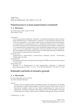 Рассмотрены проблемы, связанные с возможными разрывами между требованиями рациональности и нормативности. Показано, что рассмотрение отдельного действия или утверждения с точки зрения практической, инструментальной рациональности невозможно без одновременного учета требований рациональности эпистемической. Лишь соблюдение постулатов обоих типов рациональности позволяет надеяться на то, что рациональные основания будут иметь необходимую нормативную силу. Показано также, что и это не гарантирует совершения субъектом действия на основе рационального рассуждения. Рассмотрена перспективная типология рациональных оснований Дж. Герта, описаны ее преимущества и недостатки.
