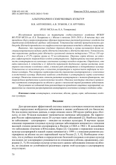 В течение двух лет проведены сбор и микроскопирование образцов пораженных растений различных семейств для определения возбудителей грибных заболеваний. Установление видовой принадлежности грибов рода Alternaria проводилось по морфологическим признакам конидий и габитусу споруляции. Выявлено, что поражение плодовых деревьев яблони и груши вызывается двумя неспециализированными видами гриба Alternaria tenuissima и Alternaria infectoria. Установлено, что поражению грибами рода Alternaria в различной степени подвергались 73% из 110 сортов яблони и 47,2% сортов груши из 53 исследованных. Описаны сорта яблони, на которых зафиксировано повреждение плодов альтернариозом. Зафиксирована высокая вредоносность альтернариоза на саженцах семечковых культур молодого возраста. Определено, что виды патогенов A. tenuissima и A. infectoria поражают двудольные сорные растения, являющиеся массовыми в плодовых садах, а также ряд садозащитных и декоративных культур. Установлена их возможная роль в качестве резерваторов и переносчиков инфекции на плодовые культуры. Рассмотрена сортозависимость поражения альтернариозом у семечковых и косточковых культур. Выделены наиболее устойчивые к альтернариозу сорта семечковых культур. Отмечена взаимосвязь степени развития альтернариоза с такими факторами, как повреждение вредителями и расположение посадок. Описаны некоторые отличия в проявлении симптомов альтернариоза на яблоне и груше в начальный период развития заболевания. В результате исследований даны рекомендации по проведению защитных мероприятий, направленных на снижение распространения альтернариоза семечковых культур в плодовых садах.