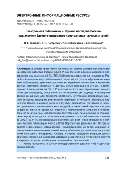 В работе представлен комплексный анализ электронной библиотеки «Научное наследие России» (ЭБ ННР) как элемента Единого цифрового пространства научных знаний (ЕЦПНЗ). Библиотека, созданная по инициативе Российской академии наук, обеспечивает открытый доступ к оцифрованным научным публикациям, архивным документам, музейным коллекциям и мультимедийным ресурсам, связанным с деятельностью выдающихся учёных. Рассматриваются этапы развития ЭБ ННР, включая переход на современную технологическую платформу, основанную на онтологическом подходе и принципах связанных данных. Это позволило обеспечить интеграцию разнородных научных ресурсов, расширить возможности навигации и улучшить поисковые процедуры. Особое внимание уделено структуре библиотеки, состоящей из административного и пользовательского модулей, а также такой функции, как расширенный поиск по связанным объектам. Анализируется наполнение библиотеки по тематическим направлениям (естественные, гуманитарные и технические науки), приводятся статистические данные о востребованности контента за 2022–2024 гг., показывающие значительный рост числа обращений к полным текстам публикаций (более 200%). Перспективы развития ЭБ ННР связываются с дальнейшим расширением мультимедийного контента, широким использованием именованных связей между объектами различного рода, развитием поискового интерфейса. Особое значение придаётся вопросам долгосрочного сохранения цифрового наследия и обеспечения устойчивого доступа к научным ресурсам для будущих поколений исследователей.