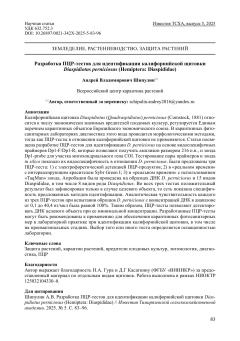 Калифорнийская щитовка Diaspidiotus (Quadraspidiotus) perniciosus (Comstock, 1881) относится к числу экономически значимых вредителей плодовых культур, регулируется Единым перечнем карантинных объектов Евразийского экономического союза. В карантинных фитосанитарных лабораториях диагностика этого вида проводится морфологическими методами, тогда как ПЦР-тесты в отношении калифорнийской щитовки не применяются. Статья посвящена разработке ПЦР-тестов для идентификации D. perniciosus на основе видоспецифичных праймеров Dp1-F/Dp1-R, которые позволяют получить ампликон размером 216 п.н., и зонда Dp1-probe для участка митохондриального гена COI. Тестирование пары праймеров и зонда in silico показало их видоспецифичность в отношении D. perniciosus. Были предложены три ПЦР-теста: 1) с электрофоретической детекцией ПЦР-продуктов; 2) в «реальном времени» с интеркалирующим красителем Sybr Green I; 3) в «реальном времени» с использованием «TaqMan» зонда. Апробация была проведена на образцах ДНК D. perniciosus и 15 видов Diaspididae, в том числе 8 видов рода Diaspidiotus. Во всех трех тестах положительный результат был зафиксирован только в случае целевого объекта, то есть показана специфичность предложенных методов идентификации. Аналитическая чувствительность каждого из трех ПЦР-тестов при испытании образцов D. perniciosus с концентрацией ДНК в диапазоне от 0,1 до 40,4 нг/мкл была равной 100%. Таким образом, ПЦР-тесты позволяют детектировать ДНК целевого объекта при ее минимальной концентрации. Разработанные ПЦР-тесты могут быть рекомендованы к применению для обеспечения карантинных фитосанитарных мер в лабораторной практике при идентификации калифорнийской щитовки, в том числе на преимагинальных стадиях. Выбор того или иного теста определяется оснащенностью лаборатории.