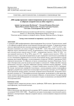 Using DNA profiling and phenotyping, 10 parental lines and 10 hybrids of sugar beet from domestic and Belarusian breeding programs were studied. Twelve microsatellite loci exhibited a high level of polymorphism information content (PIC), ranging from 0.55 to 0.83, with the highest value observed at locus Unigene 17623B (PIC = 0.83). Approximately 92% of loci across all samples possessed dominant alleles present in more than half of the samples. Among all alleles across all loci, about 55–60% were dominant (frequency > 50%), 25–30% were of intermediate frequency (20%–50%), and around 10–15% were rare alleles (frequency < 20%), indicating high conservation alongside maintained genetic diversity due to existing allelic variability. Cluster analysis performed based on the Jaccard distance matrix using the UPGMA algorithm in the PAST software delineated the 10 hybrids according to breeding groups (Ramonskaya, Lgovskaya, and Belarusian), parental relatedness, and ploidy level. The hybrid “Polibel” showed the lowest similarity to other hybrids (mean Jaccard index of 0.416), whereas the hybrid “Konkurs” exhibited the highest similarity (0.592) to the sample set. Based on genetic profiles obtained with a panel of polymorphic markers, unique molecular genetic passports were developed for the 10 hybrids. An evaluation of genotype data from the Ramonskaya, Lgovskaya, and Belarusian breeding programs was conducted over 27 biomorphological traits, including those characteristics regulated by the State Commission of the Russian Federation for Testing and Protection of Breeding Achievements (FSBI “Gossortkomissiya”) registration guidelines for hybrids.