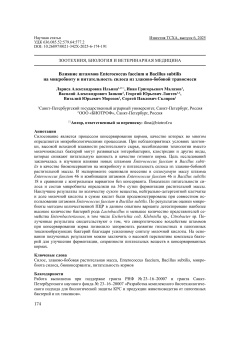 Силосование является процессом консервирования кормов, качество которых во многом определяется микробиологическими процессами. При неблагоприятных условиях заготовки, высокой исходной влажности растительного сырья, несоблюдении технологии вместо молочнокислых бактерий могут развиваться энтеробактерии, клостридии и другие виды, которые снижают питательную ценность и качество готового корма. Цель исследований заключалась в изучении влияния новых штаммов Enterococcus faecium и Bacillus subtilis в качестве биоконсервантов на микробиоту и питательность силоса из злаково-бобовой растительной массы. В эксперименте оценивали внесение в силосуемую массу штамма Enterococcus faecium 46 и комбинации штаммов Enterococcus faecium 46 и Bacillus subtilis 18 в сравнении с контрольным вариантом без консерванта. Показатели питательности силоса и состав микробиоты определяли на 30-е сутки ферментации растительной массы. Наилучшие результаты по количеству сухого вещества, нейтрально-детергентной клетчатке и доле молочной кислоты в сумме кислот были продемонстрированы при совместном использовании штаммов Enterococcus faecium и Bacillus subtilis. По результатам оценки микробиоты методом количественной ПЦР в данном опытном варианте детектировано наиболее высокое количество бактерий рода Lactobacillus и меньшее количество представителей семейства Enterobacteriaceae, в том числе Escherichia coli, Klebsiella sp., Citrobacter sp. Полученные результаты свидетельствуют о том, что синергетическое воздействие штаммов при консервировании корма позволило затормозить развитие гнилостных и патогенных токсинообразующих бактерий благодаря усиленному синтезу молочной кислоты. На основании полученных результатов можно сделать заключение о высокой перспективе комплекса бактерий для улучшения ферментации, сохранности питательных веществ в консервированных кормах.