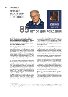 Опубликовано ср, 08/24/2022 - 17:35 пользователем Гость (не проверено)Аркадий Васильевич Соколов (род. 10 февраля 1934 г.) – библиотековед, библиографовед, специалист в области информатики, теории социальных коммуникаций. Кандидат тех- нических наук (1967), доктор педагогических наук (1978), профессор (1980)