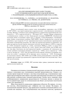 Опубликовано вт, 07/09/2024 - 16:45 пользователем Гость (не проверено)Целью исследований явился анализ связи полиморфных вариантов гена LCORL по SNP A503G у кур пород пушкинская и царскосельская с качественными показателями яйца. Выборку составили куры комбинированного направления продуктивности пушкинской (n = 107) и царскосельской (n = 90) пород 2021 г. вывода. Птица содержалась в индивидуальных клетках на базе биоресурсной коллекции ВНИИГРЖ «Генетическая коллекция редких исчезающих пород кур» (г. Пушкин, Санкт-Петербург). Генотипирование птицы осуществляли методом ПЦР-ПДРФ. Оценку биофизических качеств яиц проводили у кур в возрасте 35 нед.