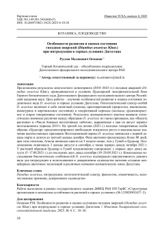 Submitted by Гость (not verified) on Wed, 02/04/2026 - 22:38The article presents the results of long-term monitoring (2018–2023) of Dianthus awaricus Khar. at the Tsudakhar experimental base of the Mountain Botanical Garden, Dagestan Federal Research Center, Russian Academy of Sciences. The study aimed to characterize the development and assess the state of this endemic species in mountainous Dagestan. The D. awaricus ontogenetic spectrum includes latent (seeds), pregenerative (seedlings, juvenile, immature, virginal) and generative (young, middle-aged, old) stages. Analysis of variance revealed statistically significant differences among D.