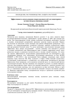 Submitted by Гость (not verified) on Sun, 03/08/2026 - 23:08Wheat powdery mildew, caused by Blumeria graminis f. sp. tritici , is a widespread disease capable of causing yield losses of up to 100% under high infection pressure. To prevent such losses, regular monitoring of crops is essential to ensure the timely application of plant protection products. Identifying the disease at its initial stage is possible through the early detection of the pathogen. It has been established that spore-trapping devices can detect pathogens when disease development rate is still below 1%, when classical monitoring methods are less effective.