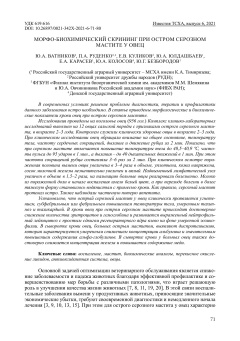 Submitted by Гость (not verified) on Tue, 07/09/2024 - 16:45Despite significant achievements in the agricultural sector, the problem of mastitis in sheep continues to be one of the most relevant for veterinary science and practice. Therefore, in current conditions, the solution of diagnosis, therapy, and prevention of this disease is urgently needed. The article presents morphological and biochemical parameters of sheep blood in acute serous mastitis. The research was at “Belozernoe” of the Salsk district of the Rostov region, with a total number of sheep of 956 heads.