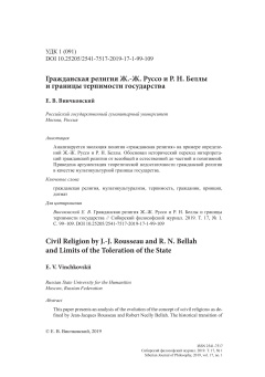 Submitted by Гость (not verified) on Thu, 09/05/2024 - 00:08This paper presents an analysis of the evolution of the concept of «civil religion» as defined by Jean-Jacques Rousseau and Robert Neelly Bellah. The historical transition of civil religion interpretations from the universal and natural to the particular and positive has been substantiated. The reasoning of the theoretical insufficiency of civil religion as a multicultural state border is given.