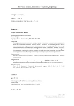 Опубликовано чт, 02/05/2026 - 17:38 пользователем Гость (не проверено)Рассматривается понятие контекста, которое наряду с понятиями реальности и нормативности является центральным понятием контекстуального реализма. Устанавливаются связи между контекстуальностью, нормативностью, концептуальностью и непредопределённостью, между понятиями контекста и релевантного (имплицитного) знания. Приводятся примеры контекстуальности, в частности, в квантовой механике. Показано, что контекстуальность – антидот против релятивизма. С точки зрения контекстуального реализма предлагается критика эпистемологического корреляционизма.