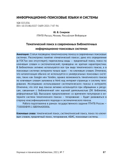 Тематический поиск в современных библиотечных информационно-поисковых системах Опубликовано ср, 08/24/2022 - 19:57 пользователем Гость (не проверено) PDF Открыть