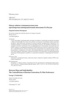 Опубликовано пт, 04/10/2026 - 11:38 пользователем Гость (не проверено)Статья анализирует противоречивые паттерны культурного потребления российской молодежи в сфере кинематографа. На основе качественного исследования, включающего фокус-групповые интервью с представителями поколения Z , выявлен парадокс одновременного стремления к популярным трендам и отторжения массово популярного контента. Исследование показывает, что молодежь использует социальные сети для информирования о кинотрендах, испытывая при этом FOMO-синдром, но одновременно проявляет алгоритмическую усталость и критическое отношение к «перехайпленному» контенту.