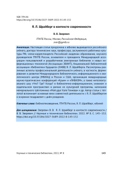 Опубликовано ср, 09/07/2022 - 23:38 пользователем Гость (не проверено)Настоящая статья приурочена к юбилею выдающегося российского учёного, доктора технических наук, профессора, заслуженного работника культуры РФ, члена-корреспондента Российской академии образования, научного руководителя ГПНТБ России, основателя и президента Международной ассоциации пользователей и разработчиков электронных библиотек и новых информационных технологий (Ассоциации ЭБНИТ), Национальной библиотечной ассоциации «Библиотеки будущего» (НАББ) Я. Л. Шрайберга.